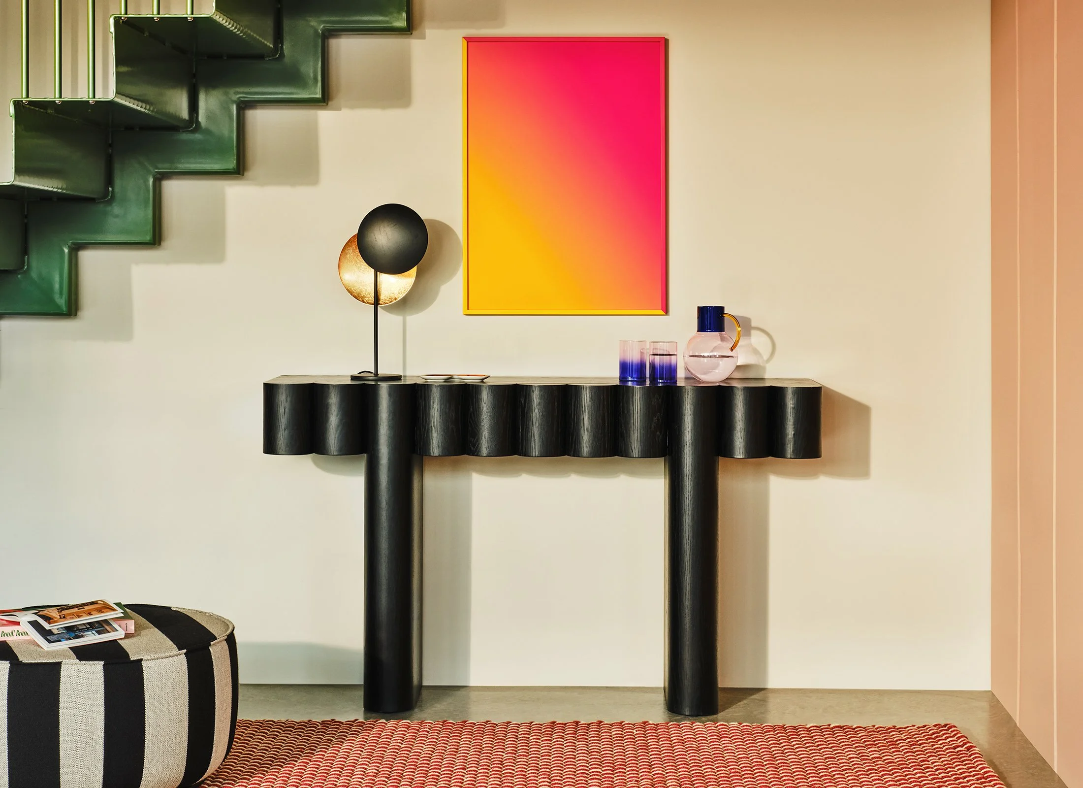 Roy console table by Heal’s, £1,199. Eclipse LED table lamp, £169. Loop rug by Heal’s, from £329. Block three tone glasses and jug by Block Design, from £30. Absorb print and frame by Lex Pott for Paper Collective, £110. Mariposa Ottoman by Vitra, £1,257.