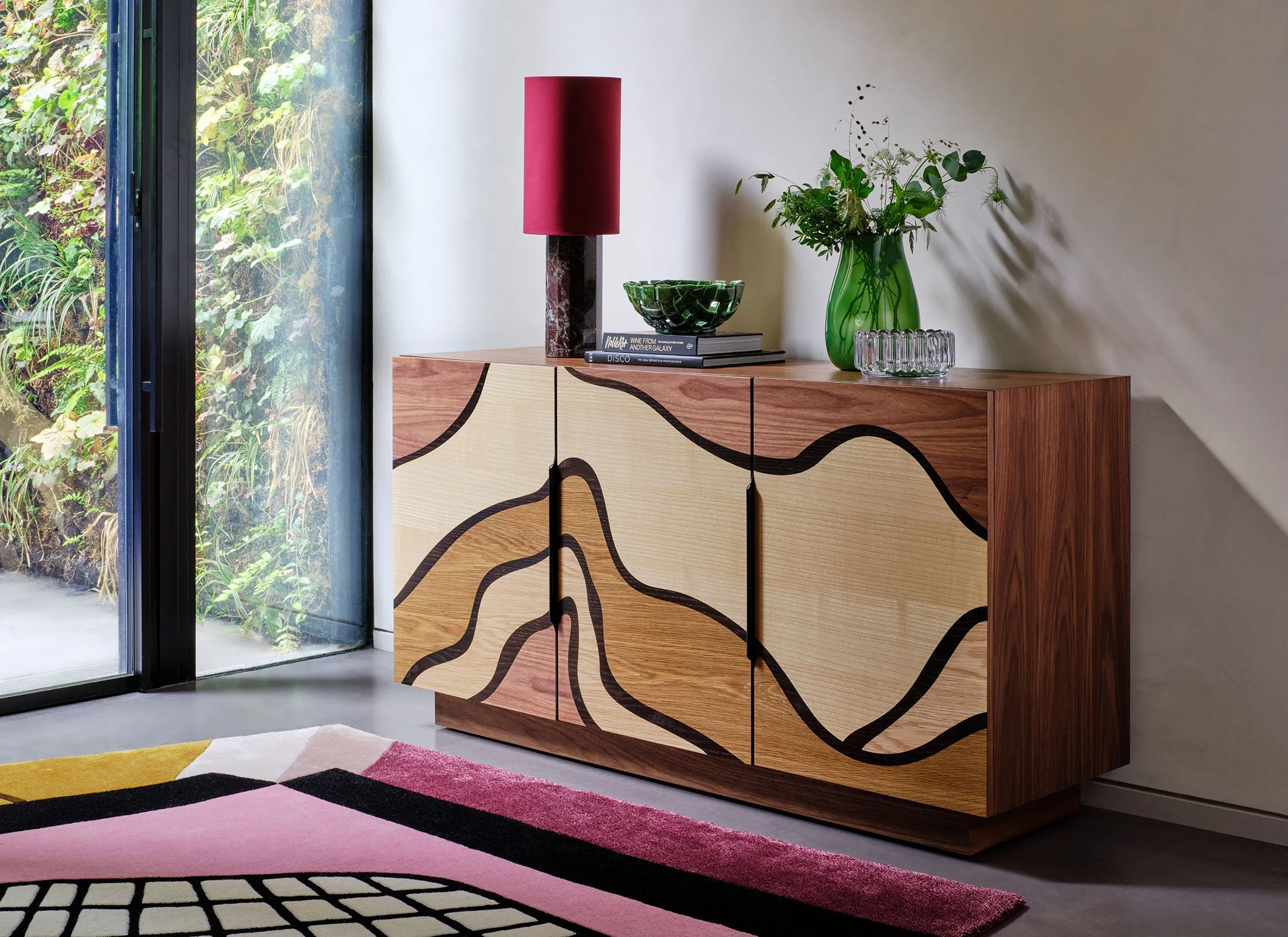 Tidal sideboard by Adam Daghorn for Heal’s, £2499, Stairline rug by HAUS ÜGER, £2,549, Colonna table lamp by Heal’s, £299, Green glass vase by Heal’s, £49.